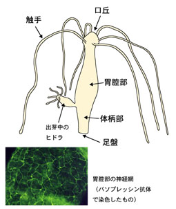 イソギンチャクやクラゲなどの腔腸動物は、最も原始的な神経系とされる散在神経系とばれる独特な神経系を持つ動物として知られている。そこで、ヒドラを実験材料として、散在神経系で働く神経ペプチドの構造と機能の解析を行っている。免疫組織化学により、ヒドラの神経系にも、ほ乳類のペプチドであるバ ソプレッシン(CYFQNCPRG-NH2)と類似のペプチドが存在すると考えられてきたが、われわれの研究により、ヒドラのバソプレッシン様ペプチドの実態は、C末端構造がバソプレッシンと共通なだけの全く別のペプチド (FPQSFLPRG-NH2)であることが明らかになった 。この研究は、藤澤敏孝博士(遺伝 研)、小泉 修博士(福岡女子大)らを中心とする研究グループとの共同研究として行っている。
