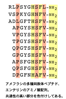 動物の神経系には、多種同族体ペプチドと呼ばれる全体の構造がよく似た多種のペプチドが存在する。神経ペプチドであるエンテリンやMIP関連ペプチドは、われわれがアメフラシ神経系から単離し構造を決定した多種同族体ペプチドであり、これら多種の ペプチドが、ひとつの神経細胞内で同時に発現し情報伝達に関わっていると考えられている。現在、このような同族体ペプチドの生理的意義を明らかにするために、ペプチド含有神経の局在や各ペプチドの生理作用の解析を進めている。